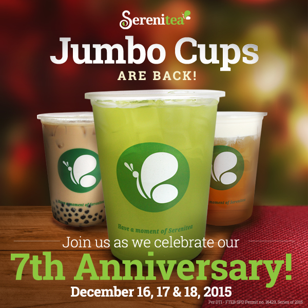 Celebrating it’s 7th year, Serenitea lovers can buy their favorite milk tea from the listed drinks and amped it up for a Jumbo Cup! I need to visit Serenitea before the offer expires!